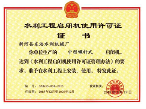 中型螺杆式启闭机许可证